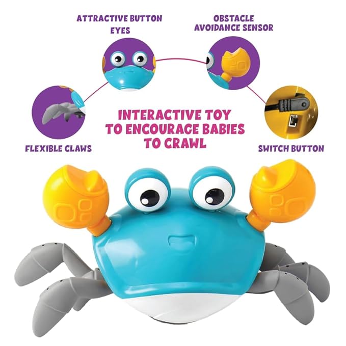 Infrared sensors let the crab navigate and change direction, so babies naturally chase it. That repeated movement builds leg strength and hand-eye coordination.
