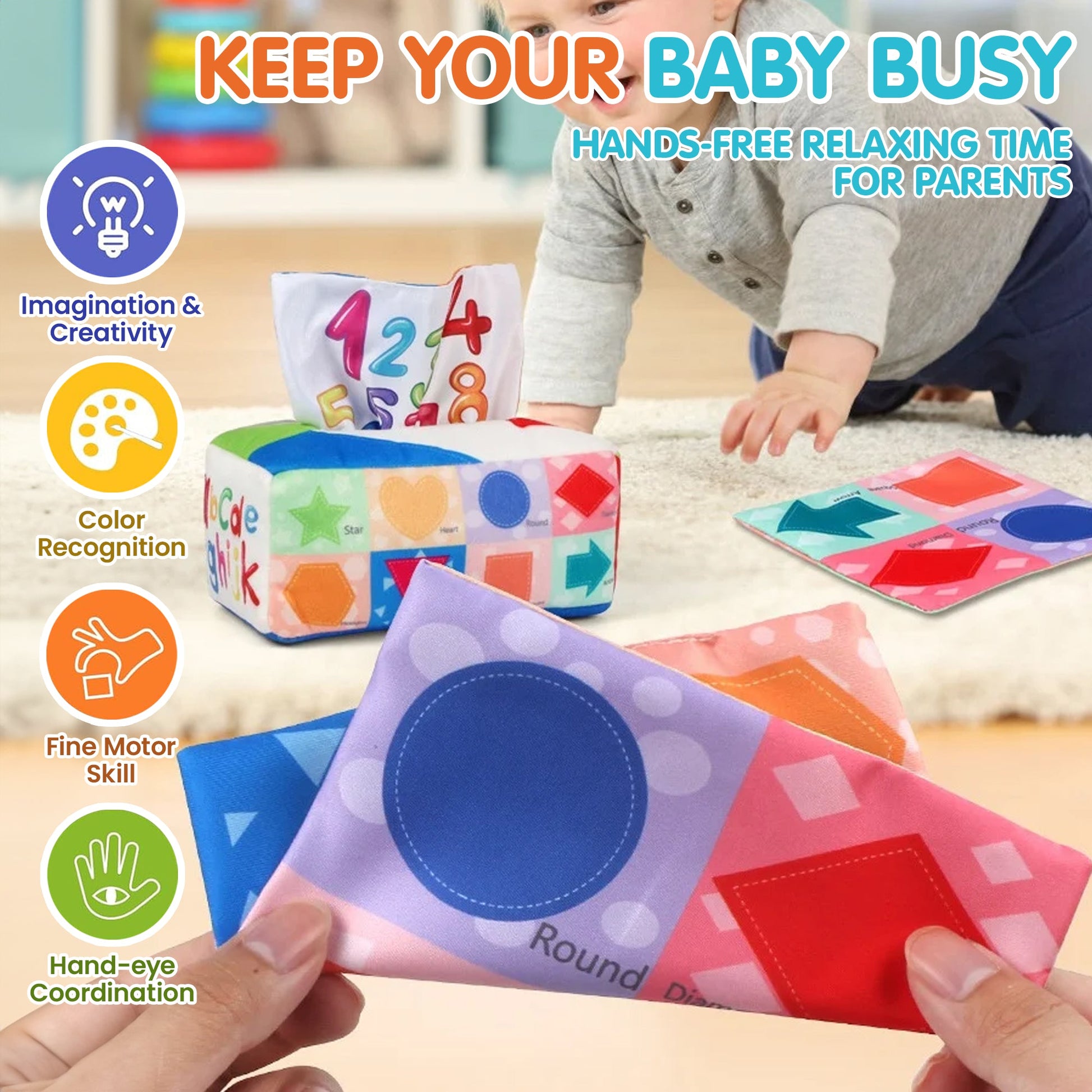 Turn short, stressful moments into calm focus. This Montessori tissue box toy keeps infants engaged with crinkle sounds and easy pulls so dads get 10–20 minutes of hands-free time to finish small tasks.